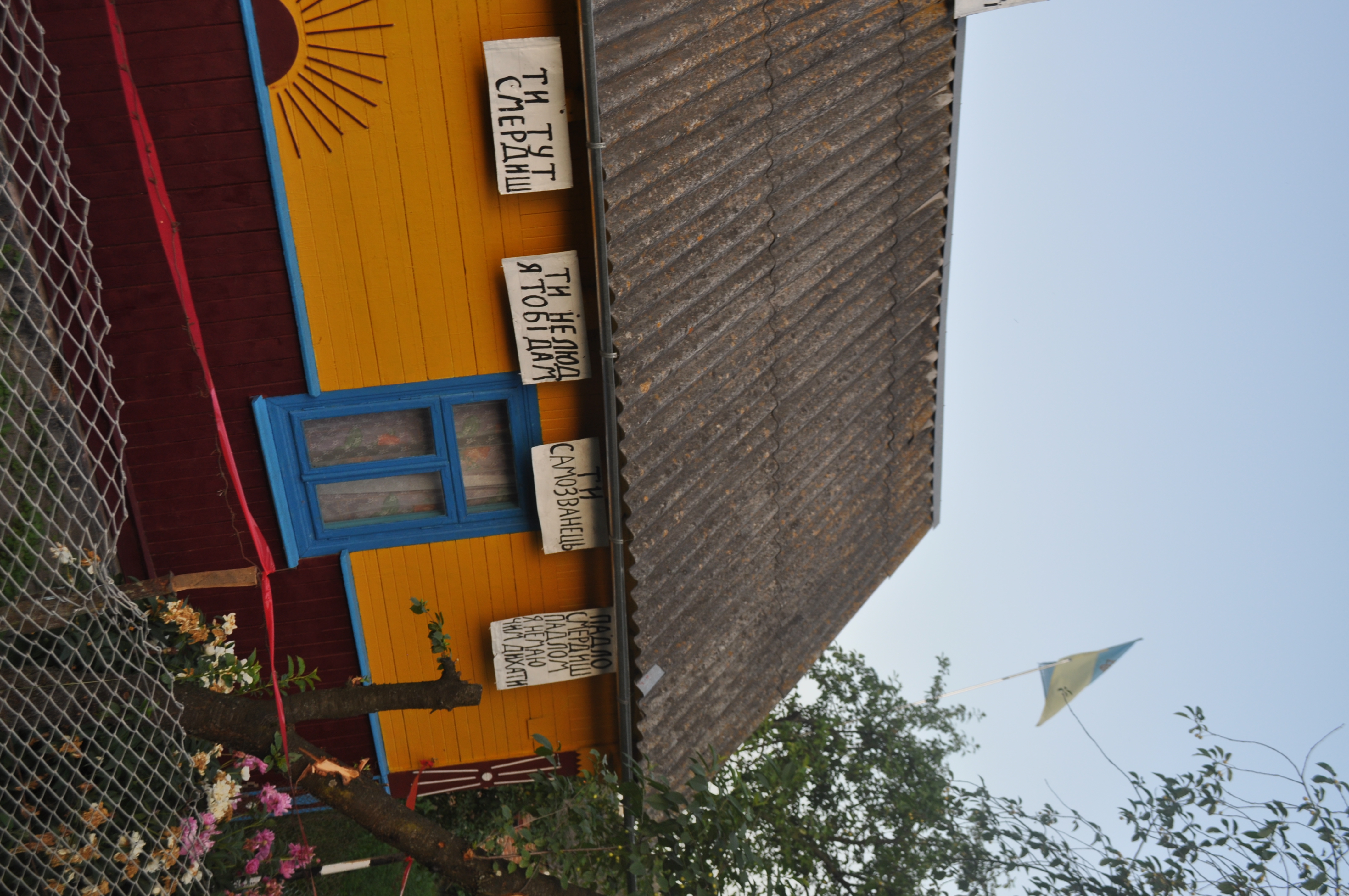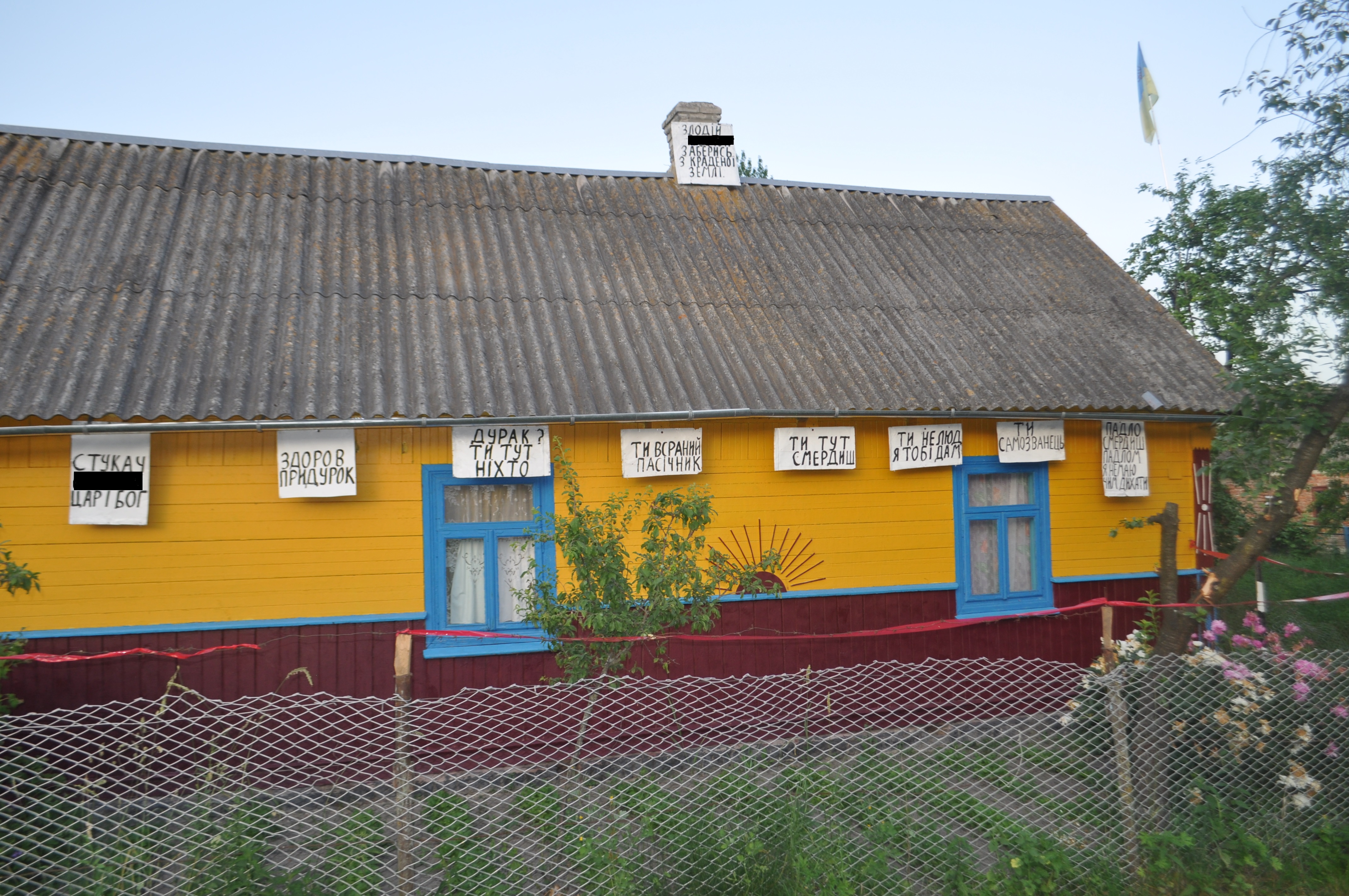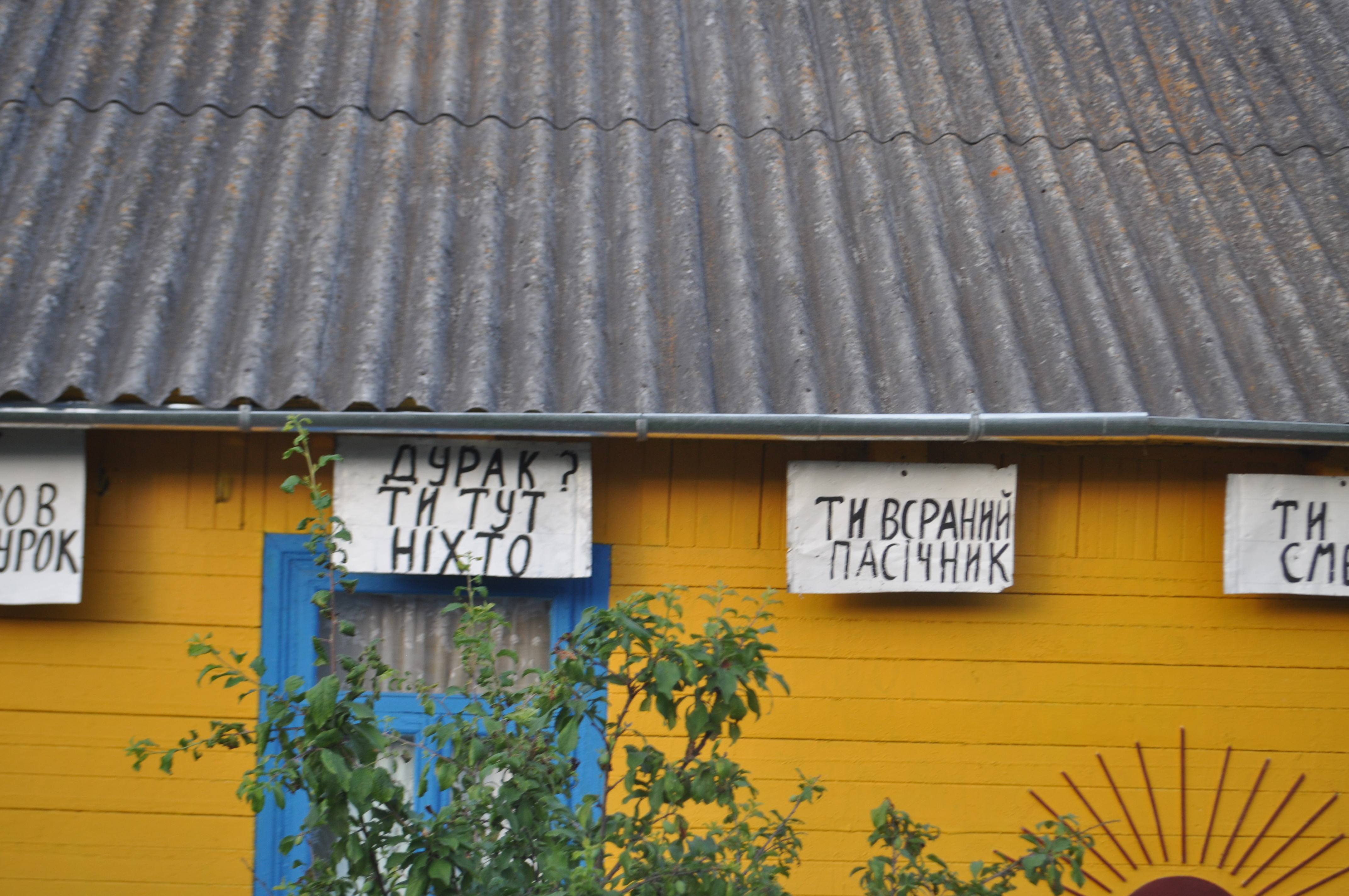 На них написи: «Злодій [прізвище], заберись з краденої землі», «Стукач [прізвище] – цар і бог», «Здоров, придурок», «Дурак? Ти тут ніхто», «Ти всраний пасічник», «Ти тут смердиш», «Ти нелюд. Я тобі дам», «Ти самозванець», «Падло, смердиш падлом, я не маю чим дихати».