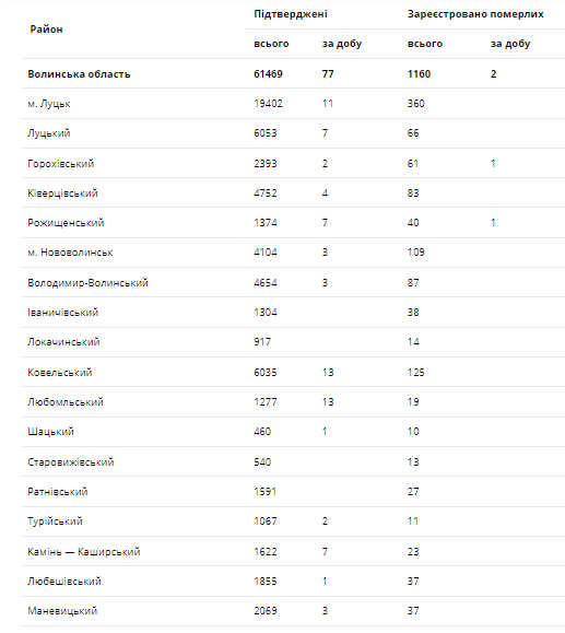 За останню добу на Волині зареєстровано 77 нових підтверджених випадків коронавірусної хвороби COVID-19 (з них дітей – 2, медпрацівників – 4). Одужало за добу – 222 особи, летальних випадків – 2.