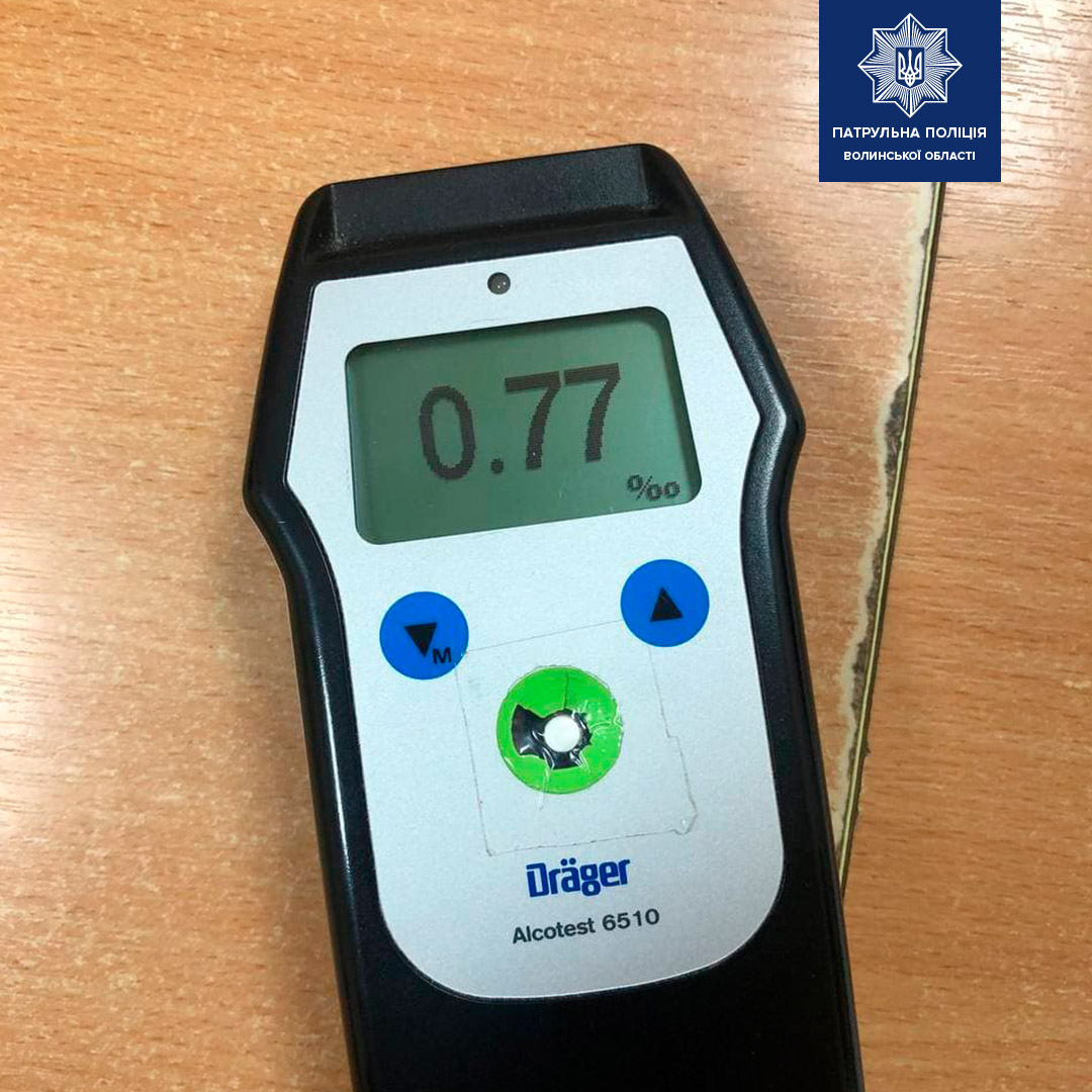 Під час спілкування із керманичем, у нього виявили ознаки алкогольного сп’яніння. Огляд на визначення стану сп’яніння у медичному закладі показав результат у 0,77 проміле, що майже в 4 рази перевищує допустиму норму. Окрім того, кермувальник не пред’явив посвідчення водія відповідної категорії.