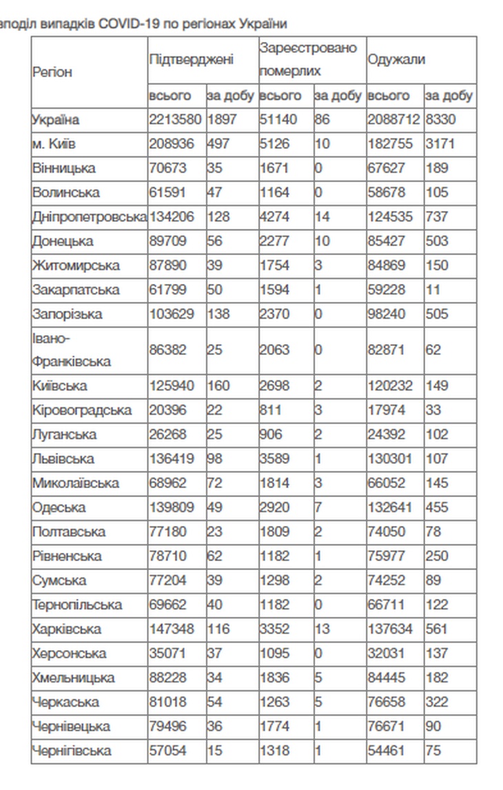 За останню добу найбільша кількість підтверджених випадків зареєстрована у м. Київ (497), Київській (160), Запорізькій (138), Дніпропетровській (128) та Харківській (116) областях.