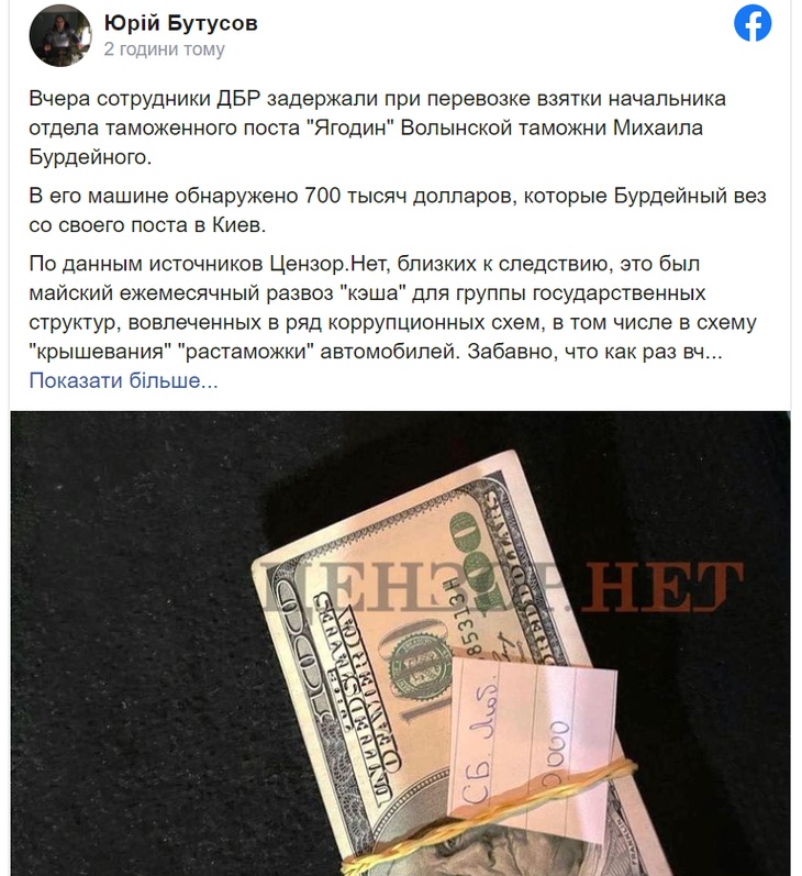 «700 тисяч доларів «кешу» – це без урахування того, що поклали собі місцеві митники та інші перевіряючі органи на місці в свою кишеню, до моменту вивезення цієї передачі. Це везе дрібний чиновник. Це всього лише один місяць (в який було 10 днів вихідних). Один пост. Однієї митниці. Причому всю схему розщеплення коштів ми не знаємо, цілком можливо, що це навіть не один канал збору коштів на «Ягодині» – додає Бутусов.