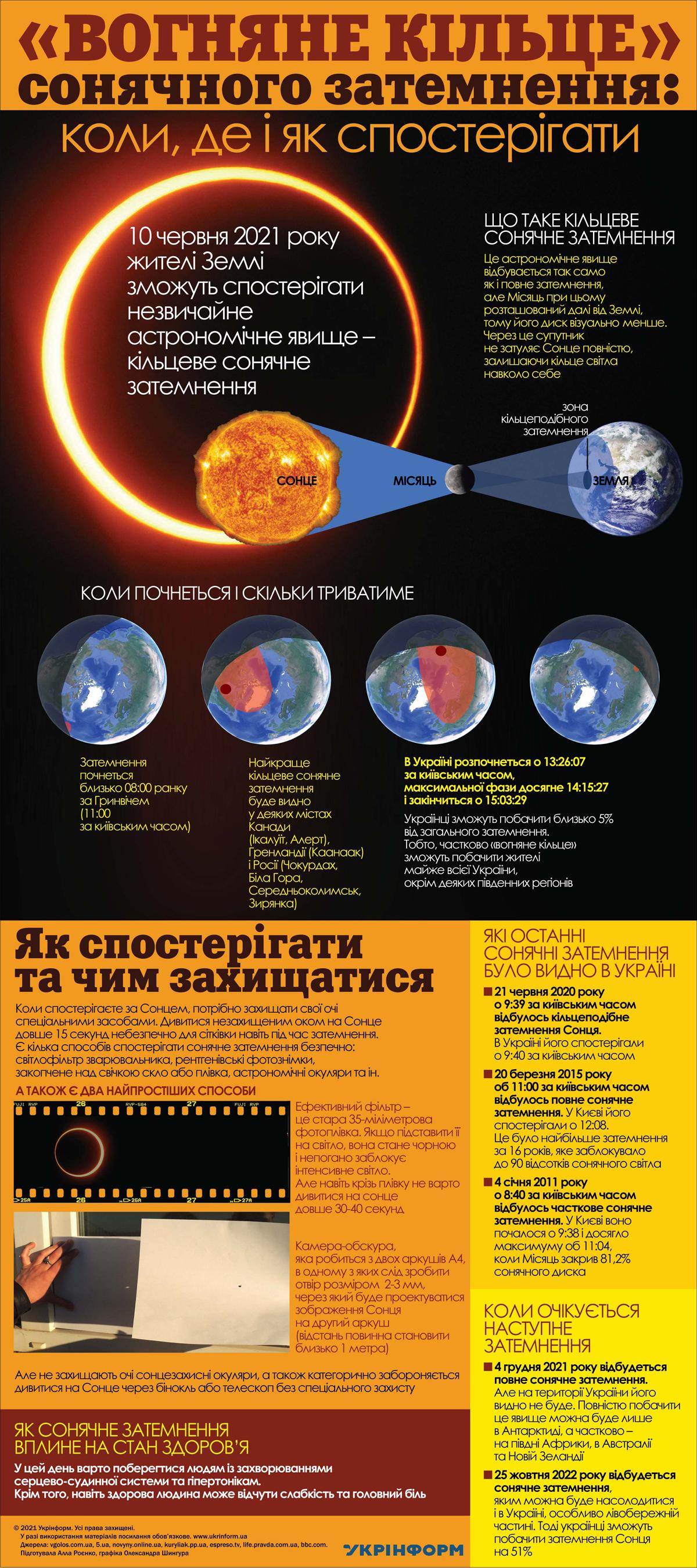 У четвер, 10 червня, жителі Землі зможуть спостерігати незвичайне астрономічне явище – кільцеве сонячне затемнення. Воно відбувається так само, як і повне, але Місяць при цьому на більшій відстані від Землі, тому не затуляє Сонце повністю, залишаючи «вогняне кільце» навколо себе.