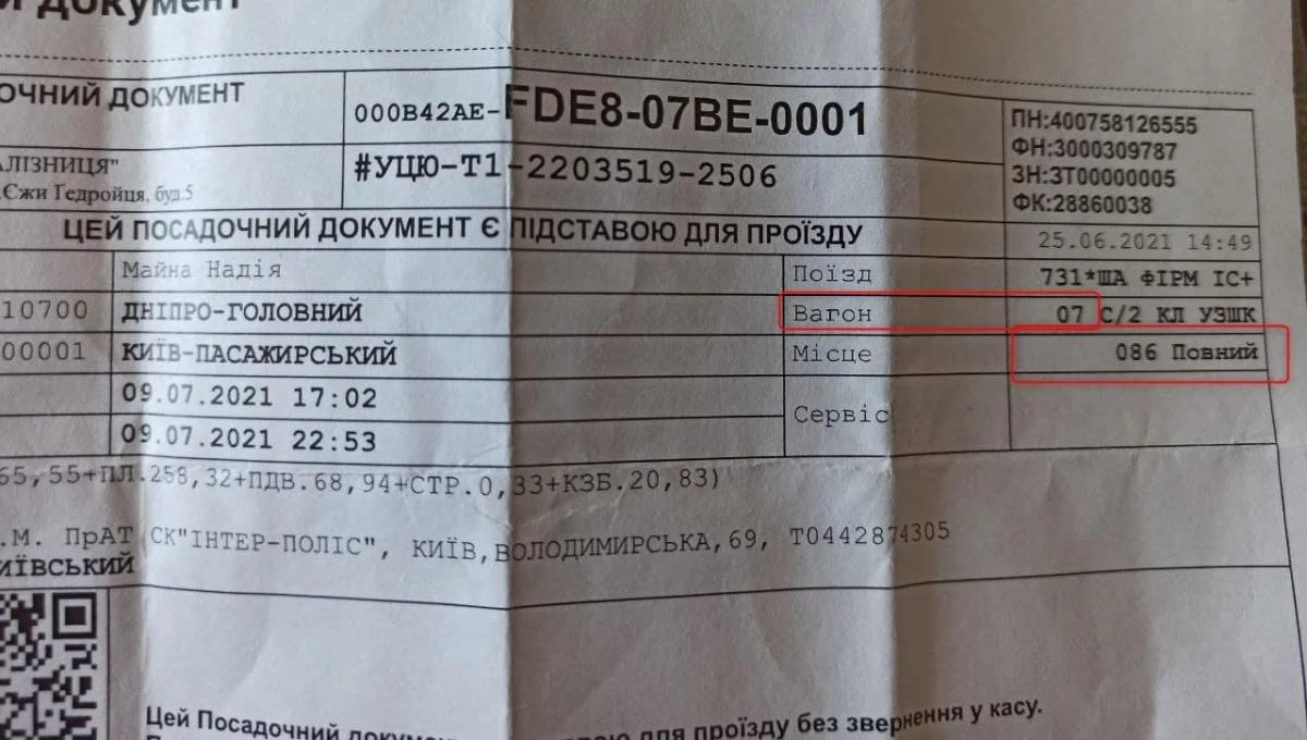 Також вона поділилася зображенням квитка. У ньому вказано 7-й вагон і 86 місце. При цьому навіть на схемі поїздів «Інтерсіті» вказується, що в 7-му вагоні тільки 81 місце.