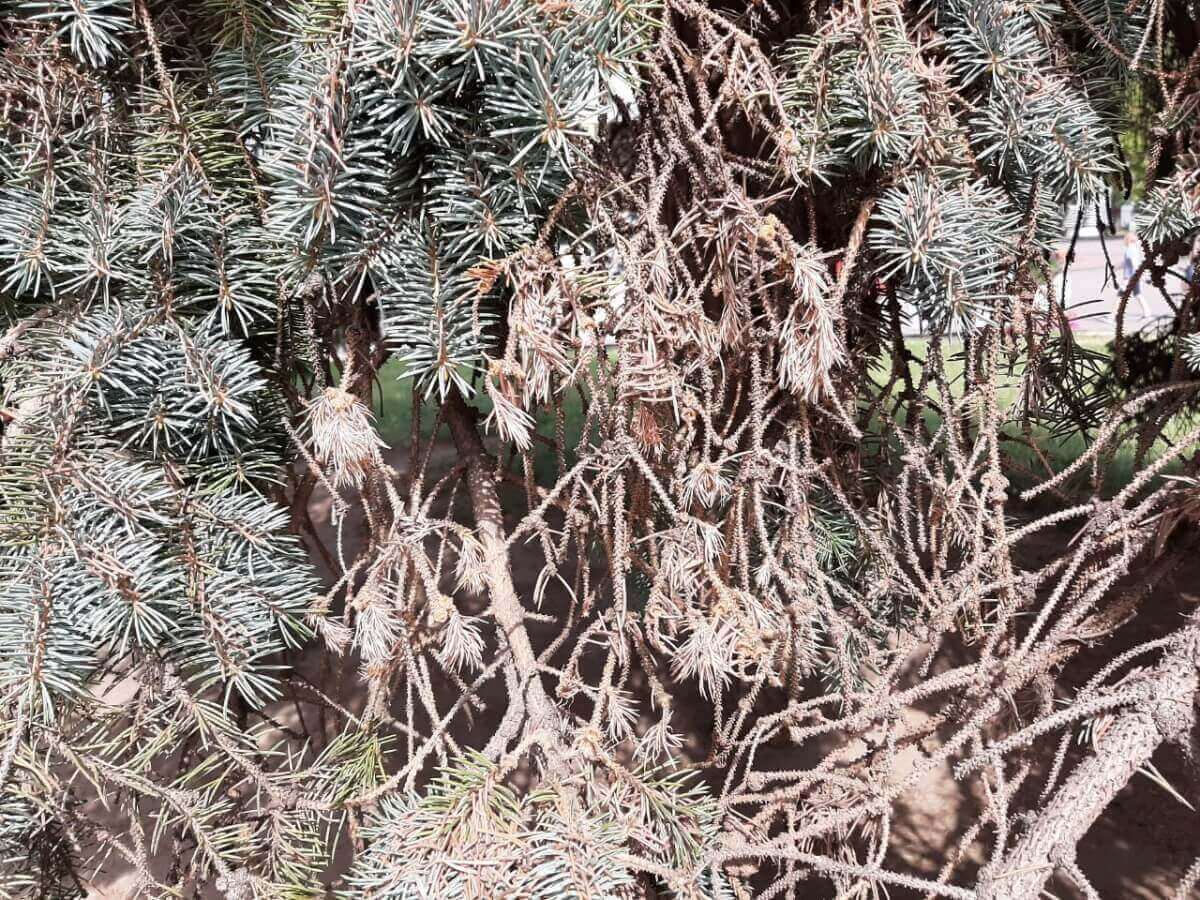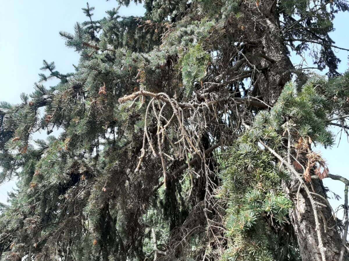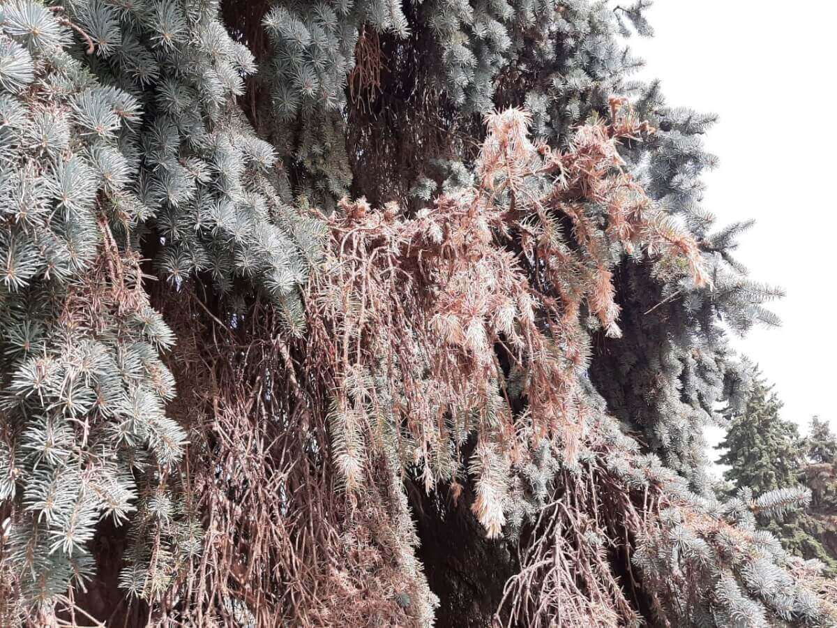 На деревах можна помітити ознаки поступового всихання. Хвоя набула коричневого відтінку. Зелених пагонів майже немає. Дерева перебувають на межі загибелі.