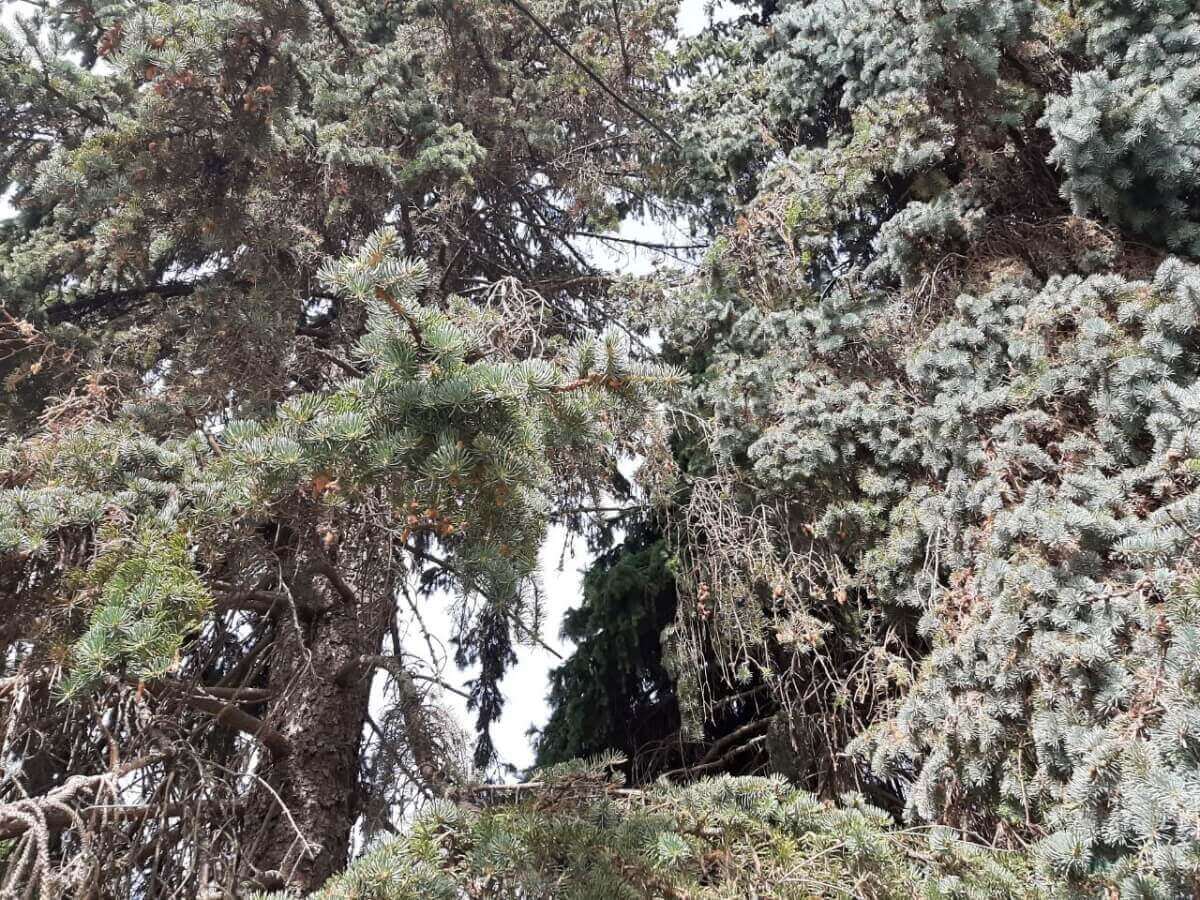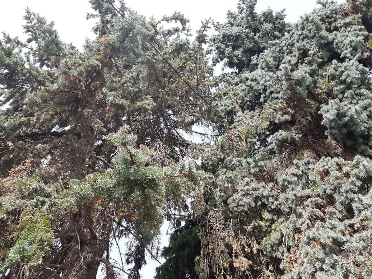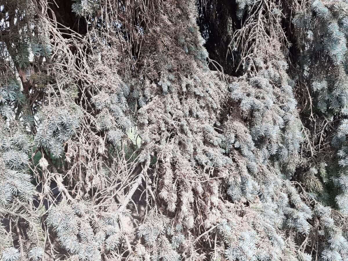 На деревах можна помітити ознаки поступового всихання. Хвоя набула коричневого відтінку. Зелених пагонів майже немає. Дерева перебувають на межі загибелі.