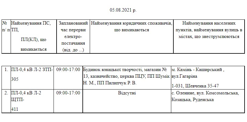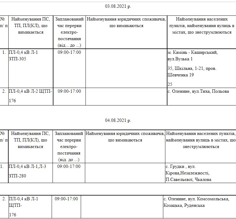 Припинення електропостачання буде відсутнє з 3 серпня по 5 серпня 2021 року на території Камінь-Каширської громади.