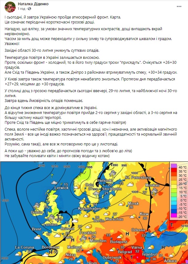 Про це на своїй сторінці у фейсбуці написала синоптикиня Наталка Діденко.