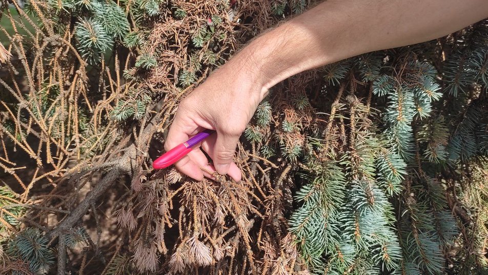 Ялинки у центрі Луцька почали всихати ще 2019-го. Щоб визначити причину, фітопатолог оглянув дерева та взяв зразки. Перші висновки після візуального огляду – хвою з'їдає кліщ.