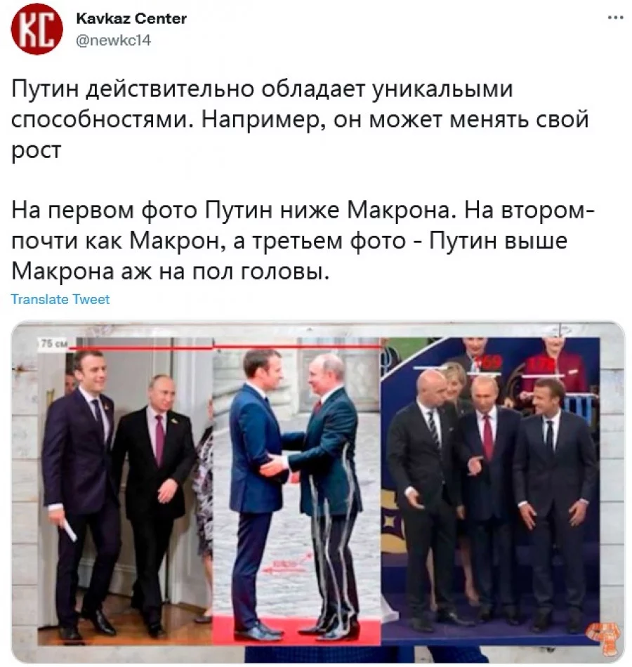 На очі кидається не лише структура лицьових м'язів і вух, а як на диво – зріст. На відомому колажі, який поширюється в соцмережах, зріст Путіна кардинально відрізняється під час зустрічей з президентом Франції в різні роки.