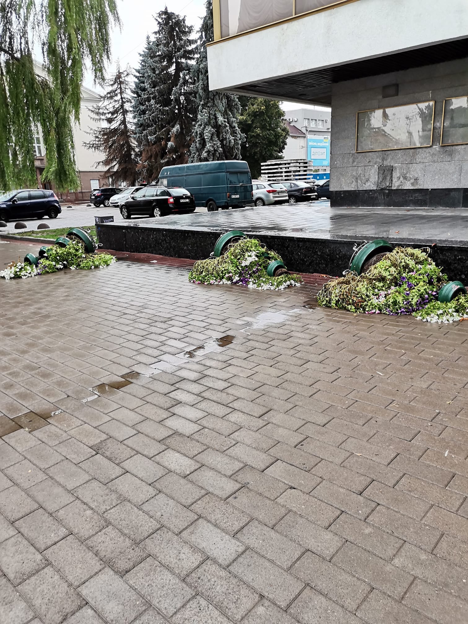 У вівторок, 17 серпня, через сильний буревій та дощ у центрі Луцька вітер зніс квіткові клумби.