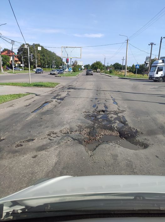 На вулиці Карпенка-Карого перед перехрестям на Задворецьку перед світлофором за зиму утворилася велика вибоїна, яку не спромоглися залатати до 19 серпня.