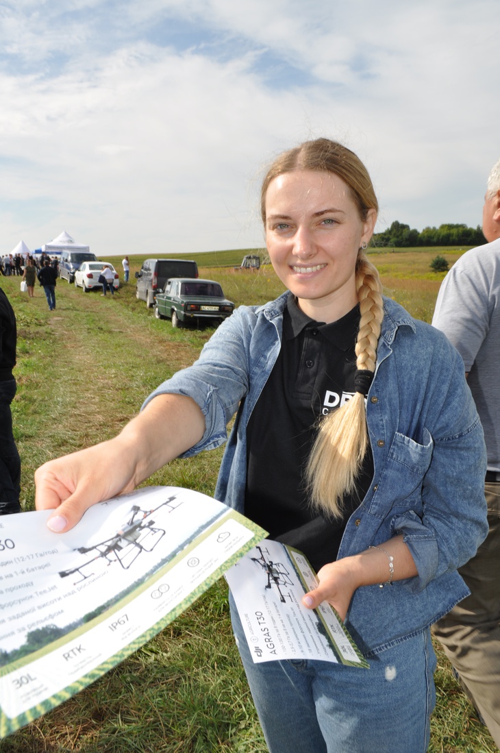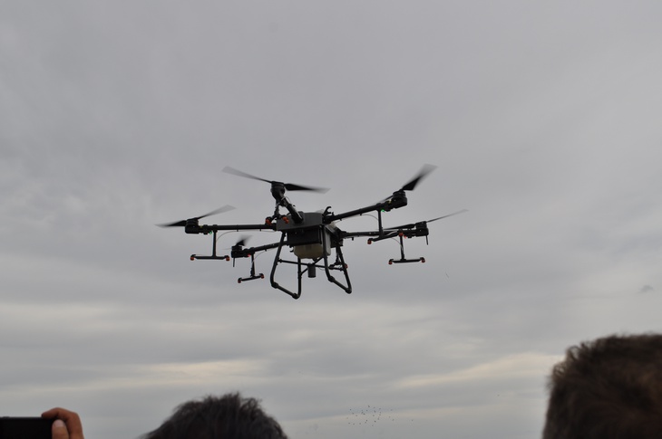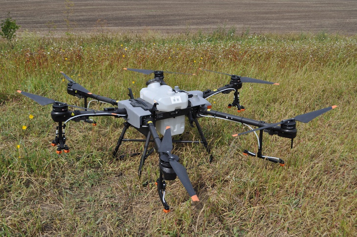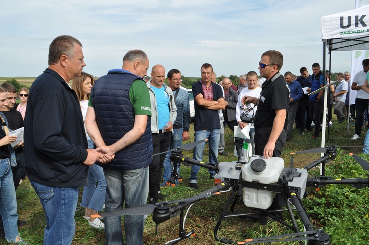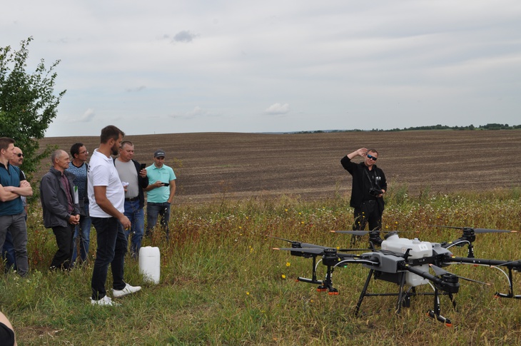 Нові партнери ФГ «Шегедин» продемонстрували в дії квадрокоптер вантажопідйомністю 40 кілограмів, який розбризкує рідину або ж розкидає тверді добрива.