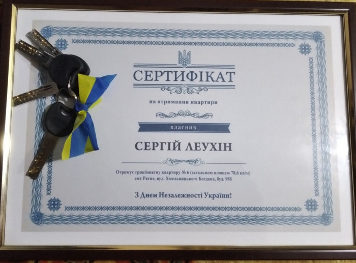 Сертифікат та ключі від квартири військовослужбовцю вручив голова облдержадміністрації Юрій Погуляйко 23 серпня 2021 року під час урочистостей з нагоди Дня Державного Прапора України, - пише Район.Ратне.