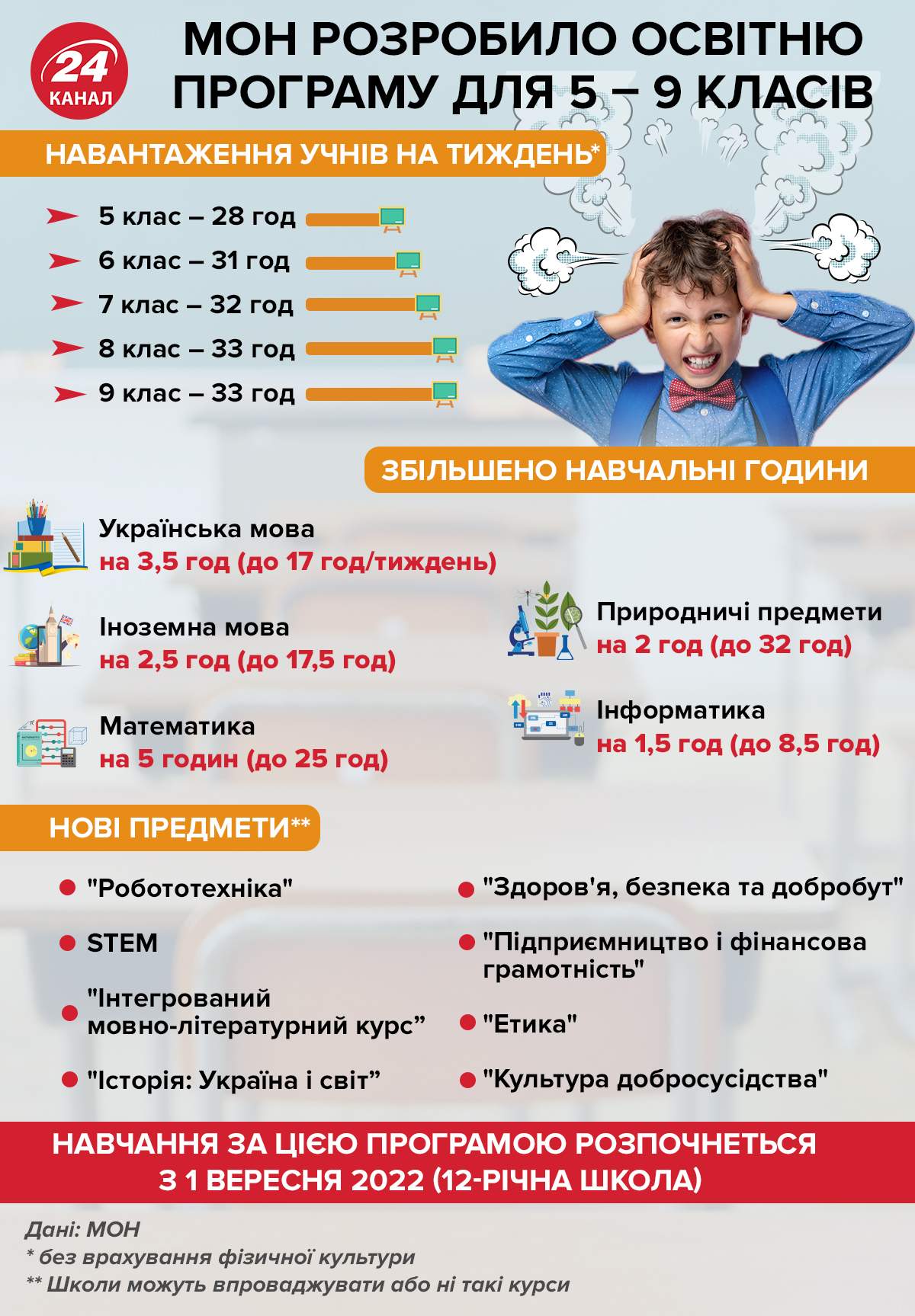 Навантаження одного навчального тижня буде становити 28 годин (980 годин на рік). Також виділено дві додаткові години для вивчення предметів освітніх галузей, курсів за вибором, проведення консультацій та групових занять.