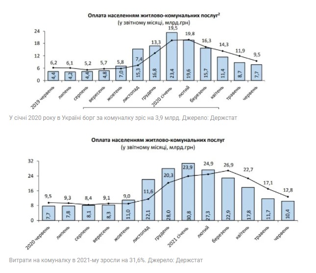 Так, згідно з даними Держстату, сумарна заборгованість за комуналку з липня 2020-го по липень 2021-го зросла з 57,9 до 66,4 млрд (або на 8,5 млрд гривень). І ситуація може значно погіршитися в наступному опалювальному сезоні: перерахують тарифи на гарячу воду й опалення.