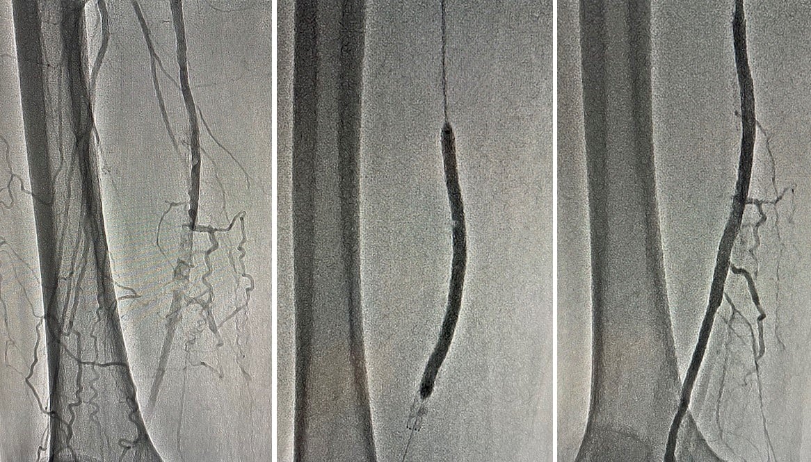 Після проведення ангіографії нижніх кінцівок діагностовано субоклюзію та оклюзію дистальних відділів поверхневих стегнових артерій – 100% і 98%. Команда ендоваскулярних хірургів провела стентування обох артерій через проколи в паху.