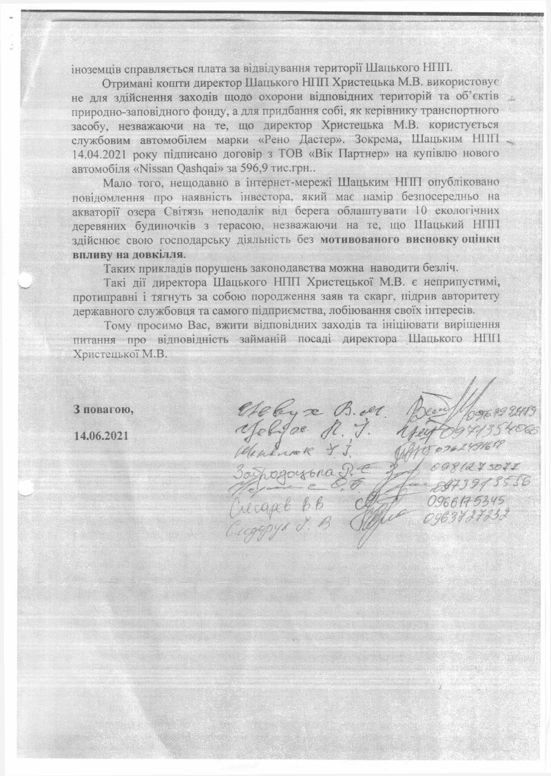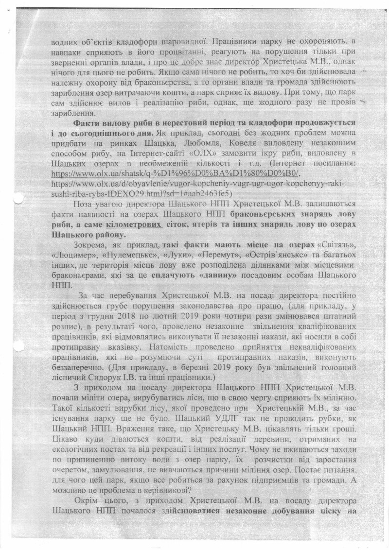 «З приходом на посаду директора Шацького НПП Христецької М.В. і по сьогоднішній день на озерах Шацького парку процвітає браконьєрство, виловлюється з озера Світязь кладофора шаровидна (зелені водорослі, що використовують як фільтр в акваріумах – ред.). За час існування парку ще такого браконьєрства, як здійснюється при директорові Христецькій М.В., не було», – йдеться у зверненні.