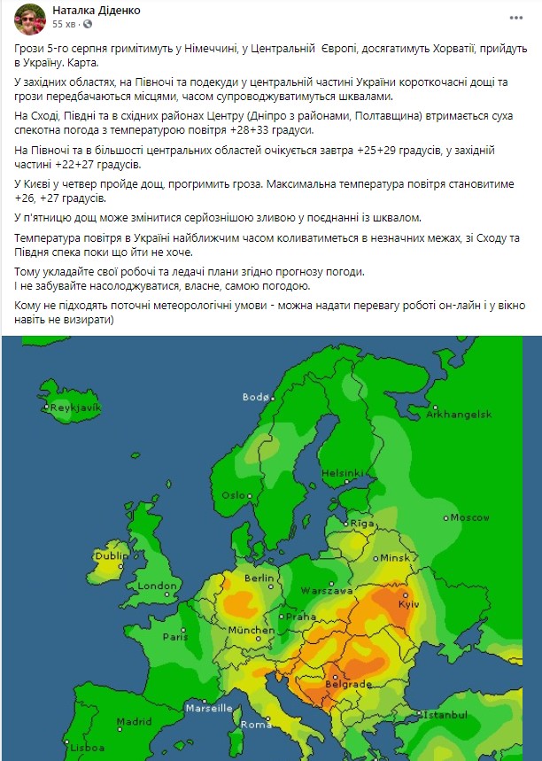 Про це на своїй сторінці у фейсбуці написала синоптикиня Наталка Діденко.