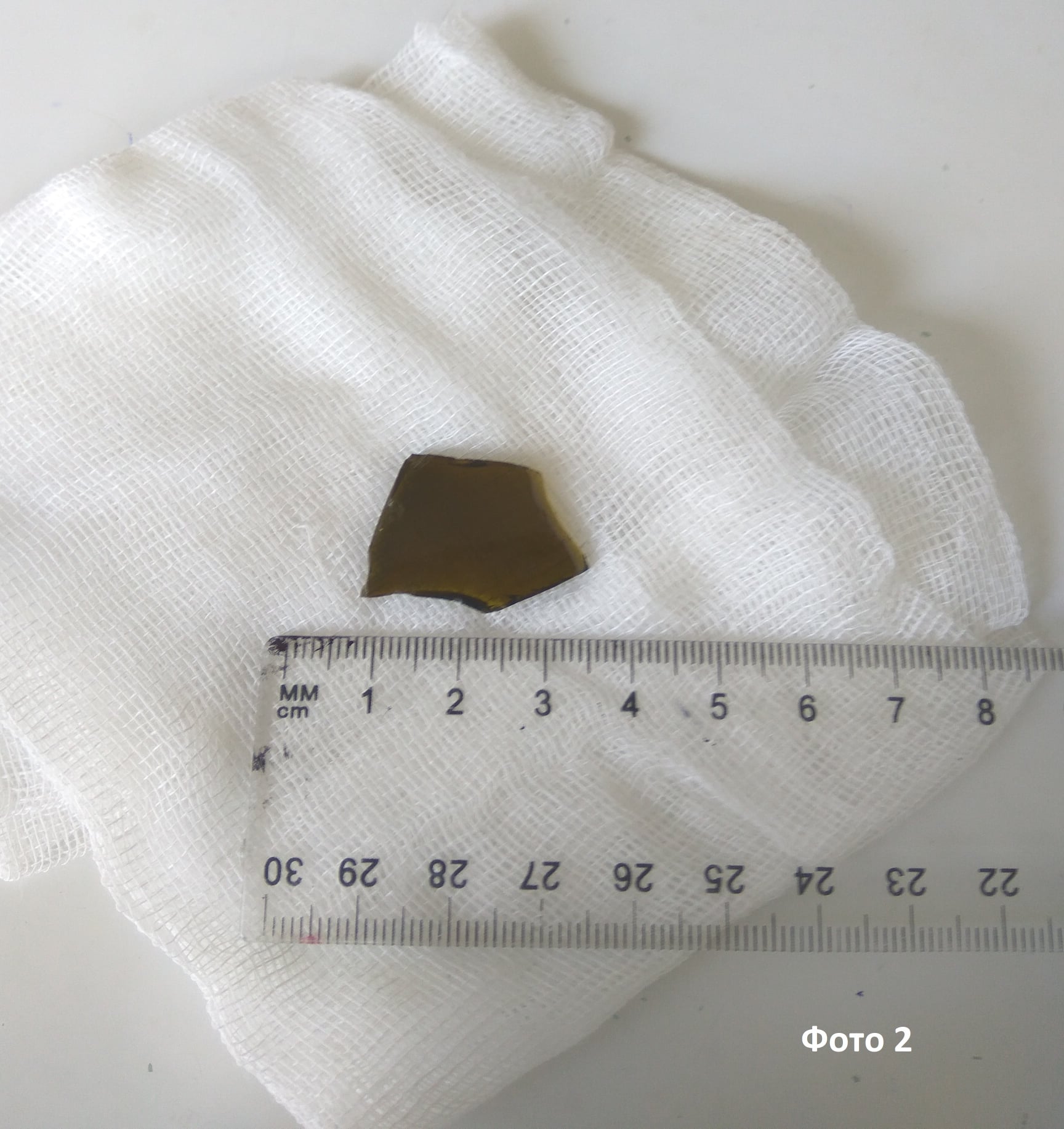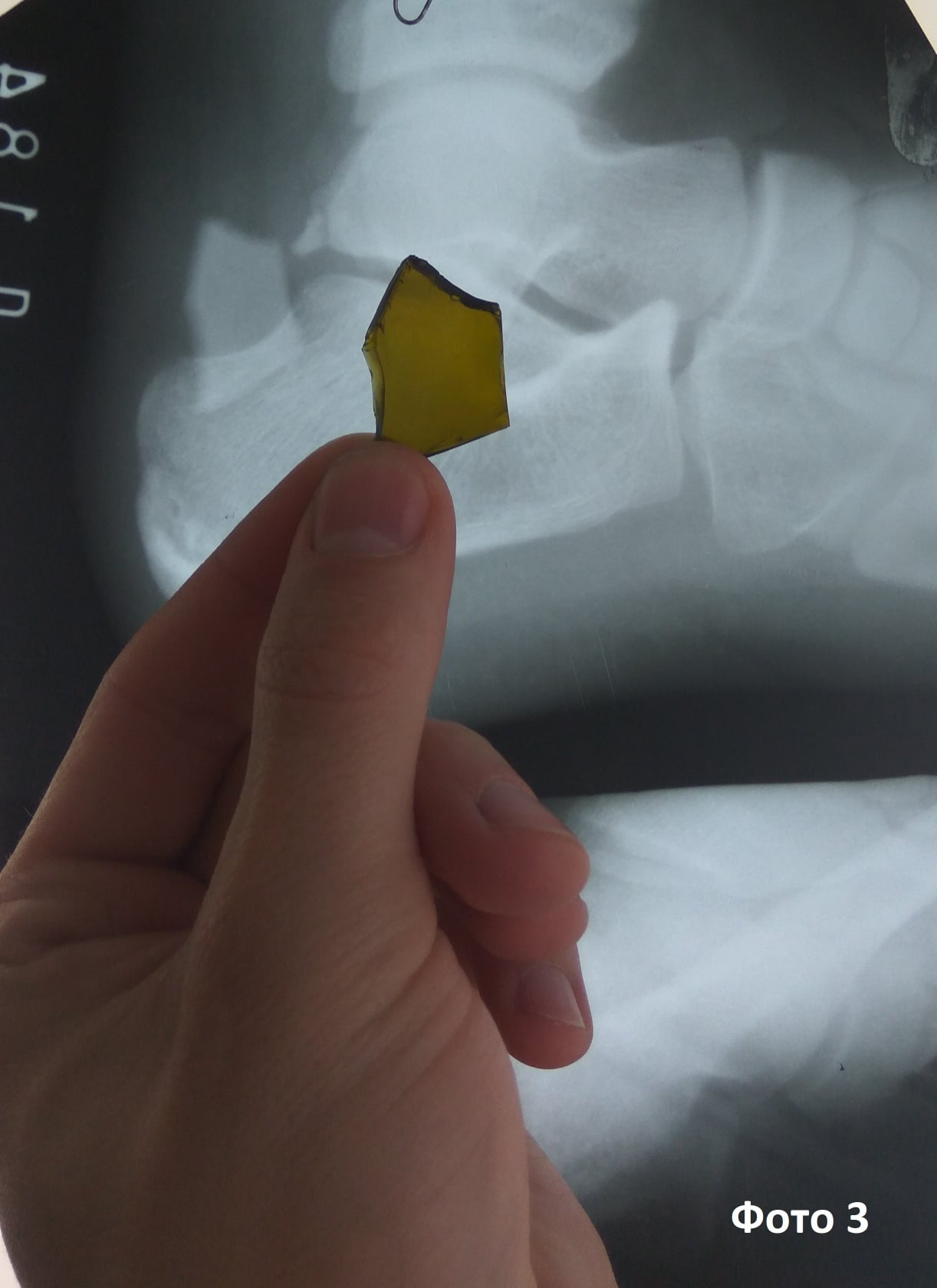 «Під час медогляду у пацієнта виявлено припухлість в ділянці стопи. Після проведеної рентгенографії знайдена загадкова скіалогічна структура ( фото 1). З анамнестичних даних з’ясовано, що більш як пів року тому було поранення в ділянці цієї ж стопи склом, особливої уваги на яке пацієнт не звернув. Після проведеного хірургічного втручання стороннє тіло успішно вилучено (фото 2,3). Слід зазначити, що не всі види скла є рентгенконтрастними. В даному випадку найймовірніше, що скло містило в своєму складі свинець, тому і було виявлене на рентгенограмі», – йдеться у дописі.