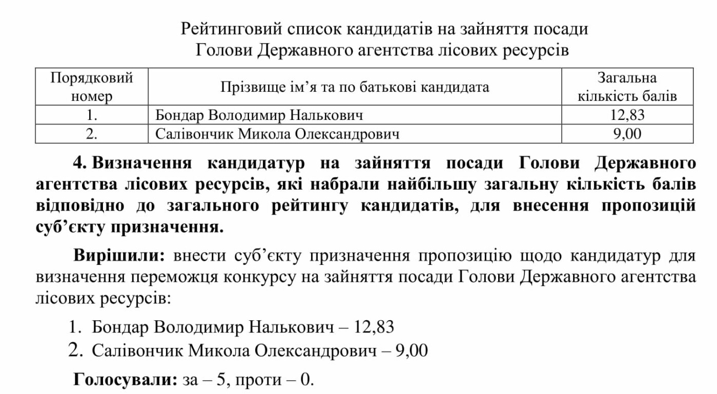 Обидві кандидатури члени комісії одноголосно (5 голосами «за») вирішили внести суб’єкту призначення для визначення переможця конкурсу на зайняття посади голови Державного агентства лісових ресурсів.