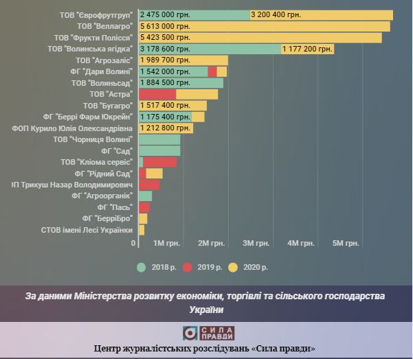 До речі, як поінфурмував Центр журналістських розслідувань «Сила правди», за підсумками 2020-го, Волинь стала третьою в державі областю за сумою підтримки аграріїв, які вирощують фрукти, ягоди та горіхи.