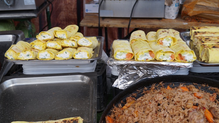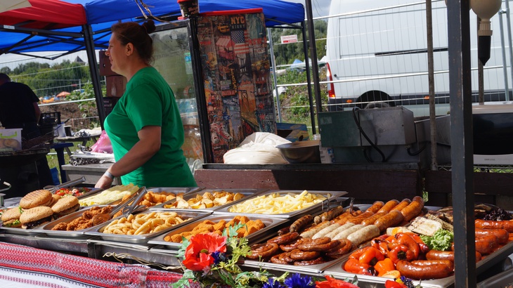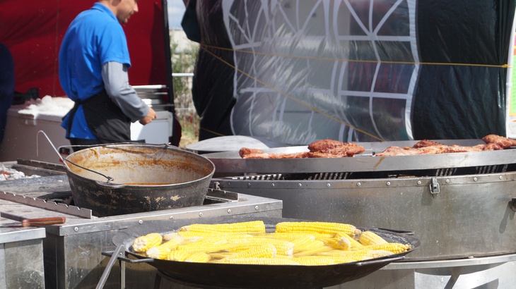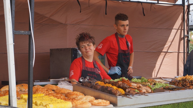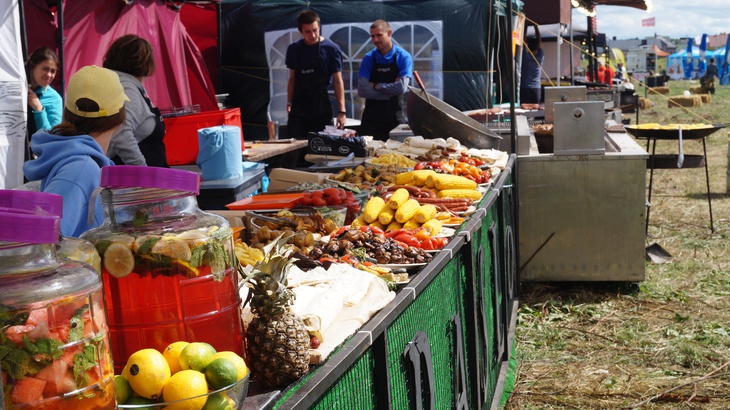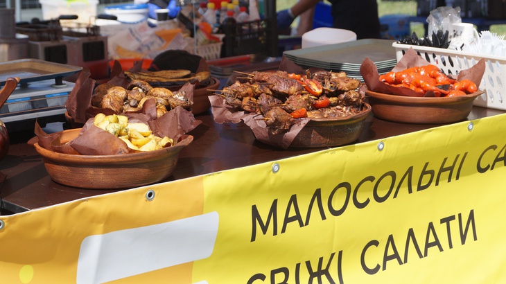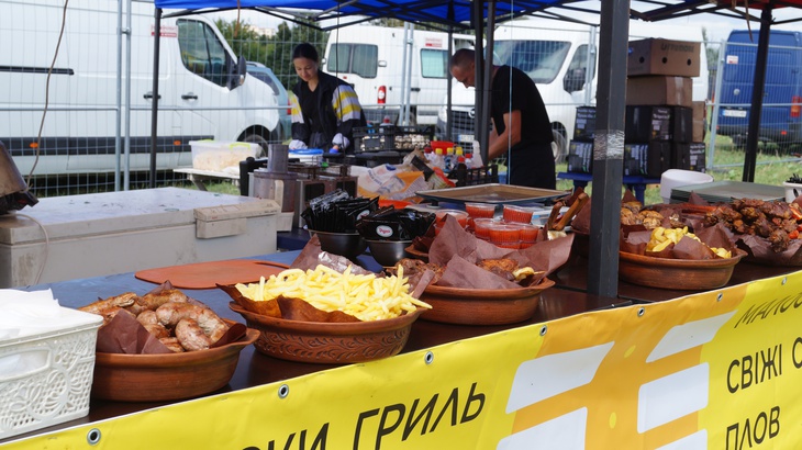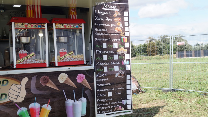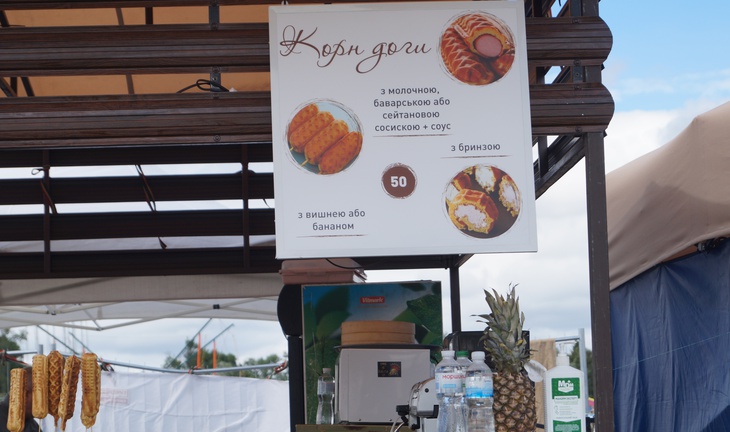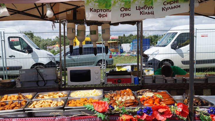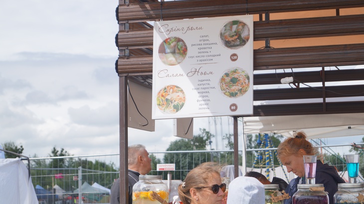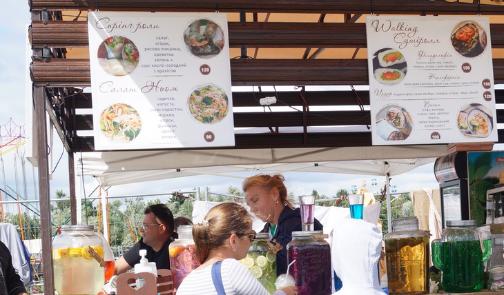 У зоні фудкорту можна поласувати різноманітними стравами. Зокрема, гостям пропонують: плов, картоплю, страви із грилю, бургери, піцу, бограч, роли, салати, кукурудзу тощо. Серед напоїв: лимонад, кава, чай, коктейлі, компоти, квас тощо.