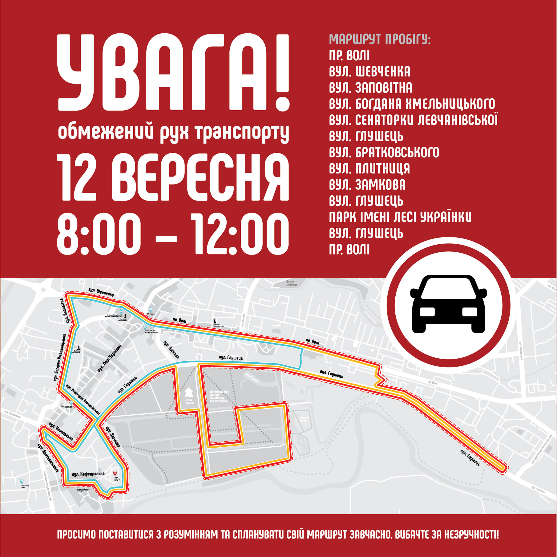 У неділю, 12 вересня, у Луцьку вшосте відбудеться Dmytruk Luchesk Half Marathon. Перекриття руху відбудеться з 8.00 год до завершення заходу. Рух автобусів на період перекриття змінено відповідно до таблиці.