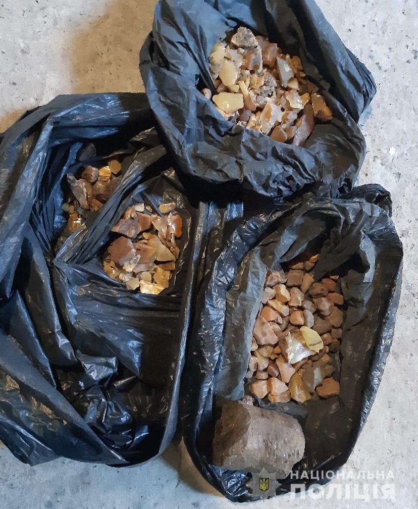 У підсобному приміщенні фігуранта правоохоронці виявили три пакети із камінням різного розміру, ззовні схожим на бурштин, вагою понад пів кілограма.