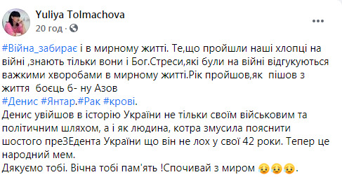 Війна забирає і в мирному житті. Те, що пройшли наші хлопці на війні, знають тільки вони і Бог. Стрес, які були на війні відгукуються важкими хворобами в мирному житті. Рік пройшов, як пішов з життя боєць б-на «Азов» Денис Янтар. Рак крові. Денис увійшов в історію України не тільки своїм військовим і політичним шляхом, а і як людина, яка змусила пояснити шостого Президента України, що він не лох у свої 42 роки. Тепер це народний мем. Дякую тобі. Вічна тобі пам'ять! Спочивай з миром, – написала вона.