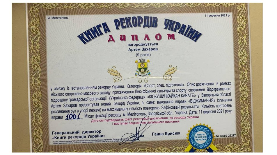 У Мелітополі 9-річний Артем Захаров встановив рекорд України, відтиснувшись від підлоги 1001 раз. Свою силу та спритність хлопчик продемонстрував під час заходу з нагоди Дня фізичної культури та спорту.