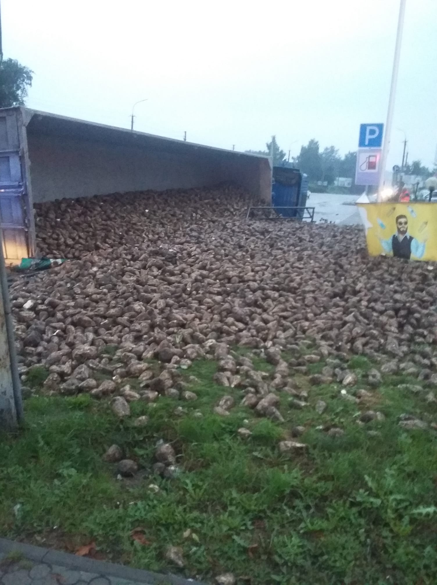 Фура перекинулася поблизу АЗС «Amic». Буряки висипалися на тротуар і газон.