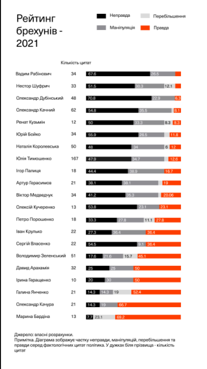 У 2020 році, як і в 2019-му, «золоту медаль» за кількістю брехні тримає Вадим Рабінович. Дуже близько за ним ідуть Нестор Шуфрич та Олександр Дубінський. Юлія Тимошенко, хоча й наговорила набагато більше фактологічних цитат, ніж її колеги в Раді, у 2020 році опинилася в середині рейтингу. Петро Порошенко був більш ніж удвічі правдивішим за лідерку «Батьківщини», а Володимир Зеленський – ще на 60% правдивішим за Порошенка. Втім, усе одно президент сказав правду в менш ніж половині випадків. І це погіршення порівняно з 2019 роком, коли 53% висловлювань президента були правдивими.