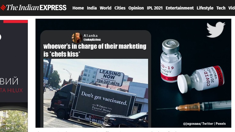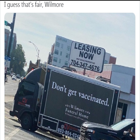 Проте, як зясувалося згодом, посилання на "Похоронне бюро Вілмора", яке було вказане на вантажівці, переадресовувало людей на веб-сайт, на якому було написано: "Зробіть вакцинацію зараз", нижче був іще один рядок: "Якщо ні, до зустрічі".