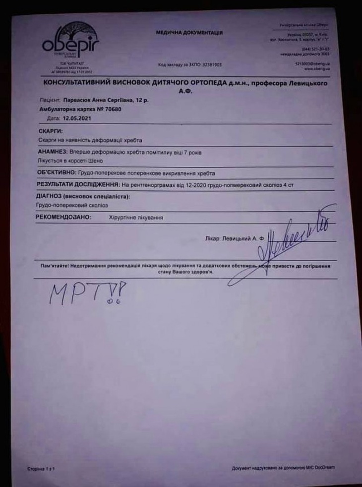 «3 роки тому в дівчинки почала сильно боліти спина. Після обстежень встановили діагноз – вроджений ідіопатичний S-подібний грудо-поперековий сколіоз 4 ст. Батьки кинулися до найкращих спеціалістів і почали лікувати – корсет Шено, лікування у ВОДКЛ, в санаторії «Пролісок», постійні реабілітації і фізичні вправи. Але, на жаль, дитячий хірург-ортопед Левицький А.Ф. (д.м.н., професор) прийняв рішення про обов’язкове хірургічне втручання з встановленням в хребет пластин. Парвасюків шокувала необхідна сума – треба придбати 2 пластини вартістю 140 тис. грн та 25 тис. грн на розхідні медичні матеріали. В родині троє малих дітей, найменшій всього рік. Мама Вікторія Парвасюк, шкільний вчитель української мови, зараз в декреті. Тато Ані працював на залізниці, одразу кинувся на заробітки. Сергій воїн 51 ОМБР, воював на Сході в пекельному 2014, повернувся з війни з важким пораненням, ніколи ні на що не жаліється і нічого не просить», – йдеться у дописі.