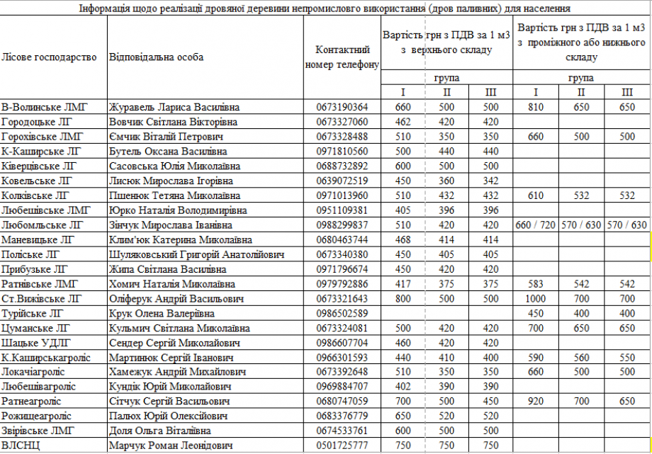 Номери телефонів відповідальних за реалізацію дров паливних можна знайти також у рубриці «Заготівля та реалізація дров паливних».