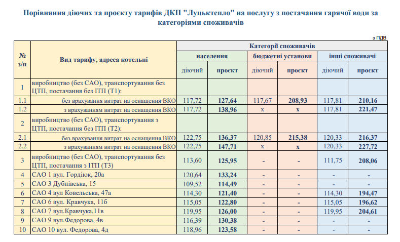 На скільки зросли тарифи, можна дізнатися із порівняльної таблиці діючих до 1 жовтня 2021 року та проєкту тарифів ДКП «Луцьктепло» на теплову енергію та послугу з постачання теплової енергії за категоріями споживачів, затвердженого сьогодні на засіданні виконкому:
