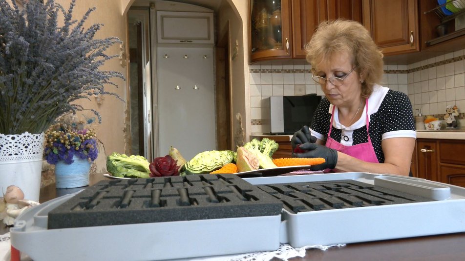 «Перший в мене був помідор, то вирізати важко і мучилась з ним. Потім спробувала кавуна. Зараз на моркву йде годину, на кавун – до восьми годин. З бурячка я вже на сьогодні можу вирізати розочку таку за 20 хвилин», – каже Ольга Гончарук.