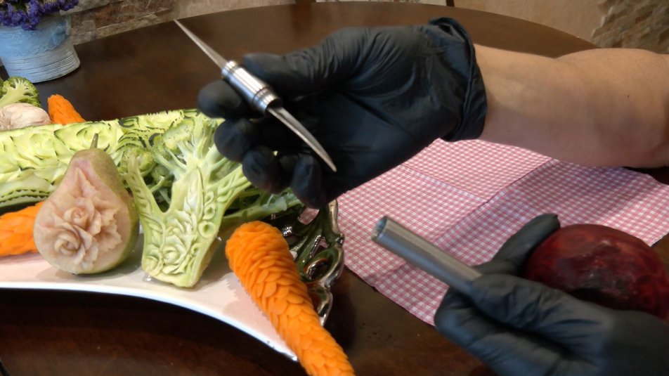 Деякі сирі овочі, загорнуті в харчову плівку, у холодильнику можуть зберігатися тиждень, каже майстриня. Карвінг – кропітка праця, яка займає багато часу. Інструмент надзвичайно гострий, тому, зі слів лучанки, поки різьбленню не навчає онуків.