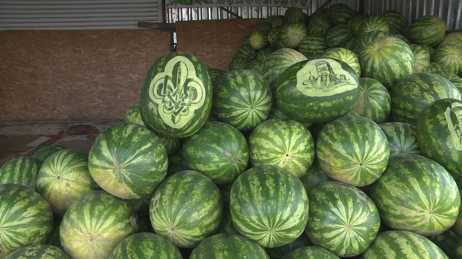 Серед малюнків на овочах, фруктах і ягодах – патріотичні орнаменти, Луцький замок, квіти, абстрактні візерунки. Різьбить кавуни жінка на прохання одного з продавців. Захід Алієв говорить: ягоди з патріотичними написами передає бійцям на схід.