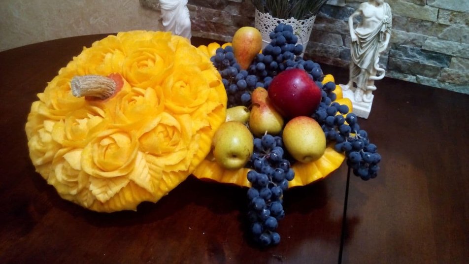 «Диня, гарбуз дуже гарно. Пекінська капуста виходять гарні хризантеми. Морква буряк, тут я вирізала грибочок печеричку. Капуста броколі. Яблука, груші, картопля, навіть на бобах і часничинках», – говорить жінка.