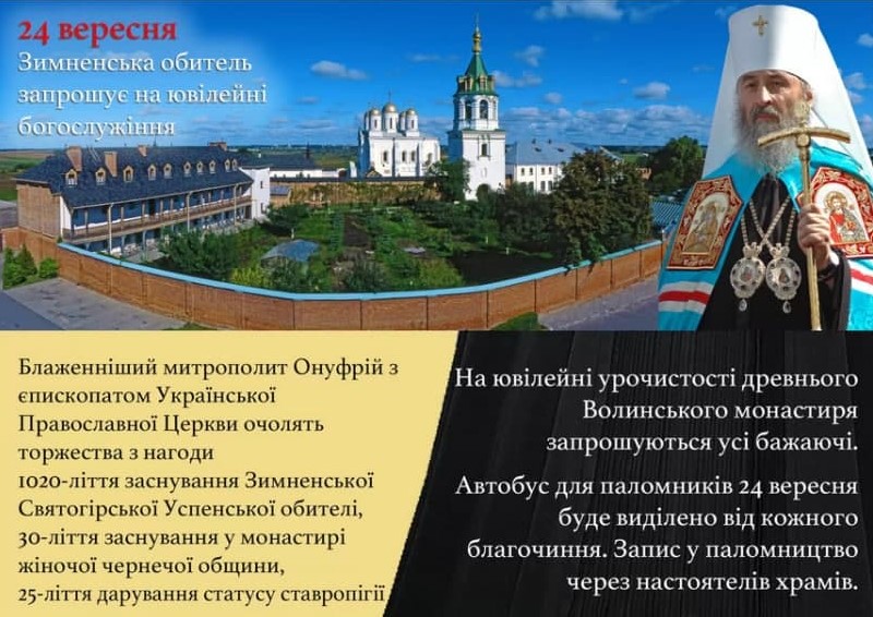 24-го вересня в село Зимне Зимнівської громади Володимир-Волинського району з нагоди ювілейних дат заснування та відродження Святогірського Успенського Зимненського монастиря приїде настоятель УПЦ митрополит Онуфрій.