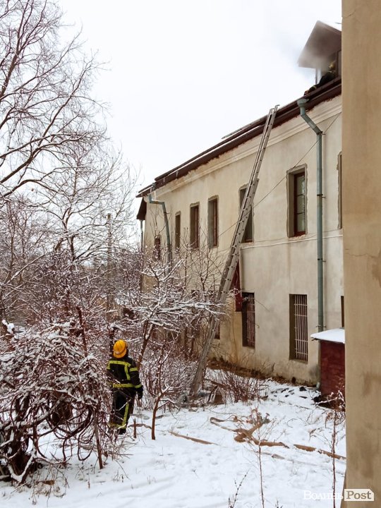 Займання сталося за адресою Кафедральна, 17. На фото видно, що дим іде з горища будівлі.