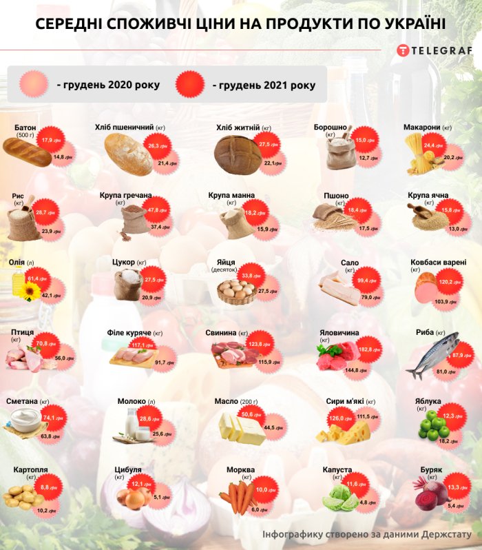Одна з головних українських страв – борщ, обійдеться кулінарам дорожче. Кілограм свинини в середньому по Україні подорожчав із 115,9 гривень до 123,8. Злетіли в ціні вдвічі і більше цибуля, капуста та буряк, подорожчала морква. Стала дешевшою лише картопля – у грудні 2021 року за неї просили 8,8 гривень проти 10 гривень 20 коп. в аналогічний період 2020. Ще одним продуктом, що втратив у вартості, стали яблука.
