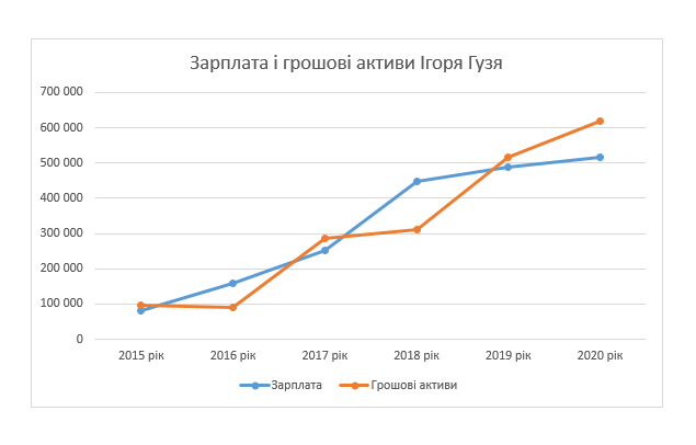 2020-й – це наразі останній рік, за який подано декларацію паном Ігорем. У той рік змін у майновому стані не відбулося. Однак традиційно зросла зарплата нардепа – до понад пів мільйона гривень за рік. Тобто за місяць народний обранець отримував більш як 43 тисячі гривень. Також 2020-го зросли і заощадження Ігоря Гузя – до 618 тисяч.