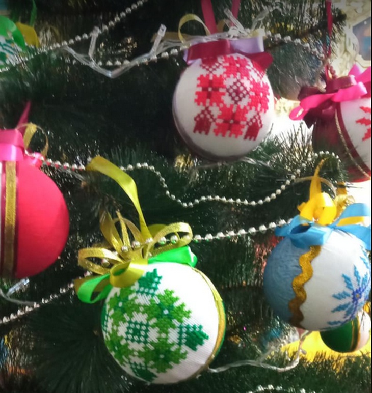 Орнаменти вишивки Галина Дмитрівна обирала з вирізок із журналу «Радянська жінка», який колись передплачувала її мама. Каже, не хотіла на кульках вишивати, приміром, квіти, а вирішила, що для прикрас для храму, краще підійдуть геометричні візерунки. Нитки підібрала трьох основних кольорів: зеленого, синього та червоного у кількох відтінках, які поєднувала в оригінальні композиції. Де-не-де додавала трішки жовтих вкраплень.