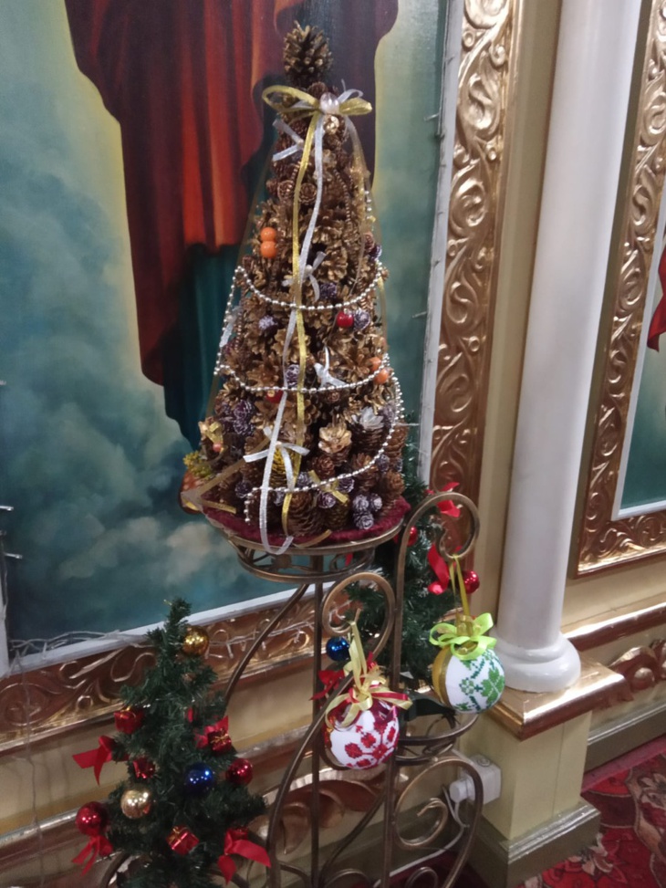 Прикрашають Зорянську церкву також вісім виготовлених Галиною Дмитрівною ялинок із шишок, що оздоблені стрічками, намистинками, блискітками. Робота над цими композиціями стала своєрідною розрадою для жінки у період боротьби з коронавірусною інфекцією. Творчість рятувала від важких думок. Як розповідає пані Галина, на створення цих декорацій знадобилося близько мішка шишок, які зібрали й принесли односельці, а ще вони допомогли придбати усі інші необхідні матеріали для створення таких виробів – як тільки хтось у справах їхав у місто, то цікавилися у Галини Дмитрівни, яких елементів для композиції потрібно докупити, також необхідні елементи декору привозив отець Віталій.