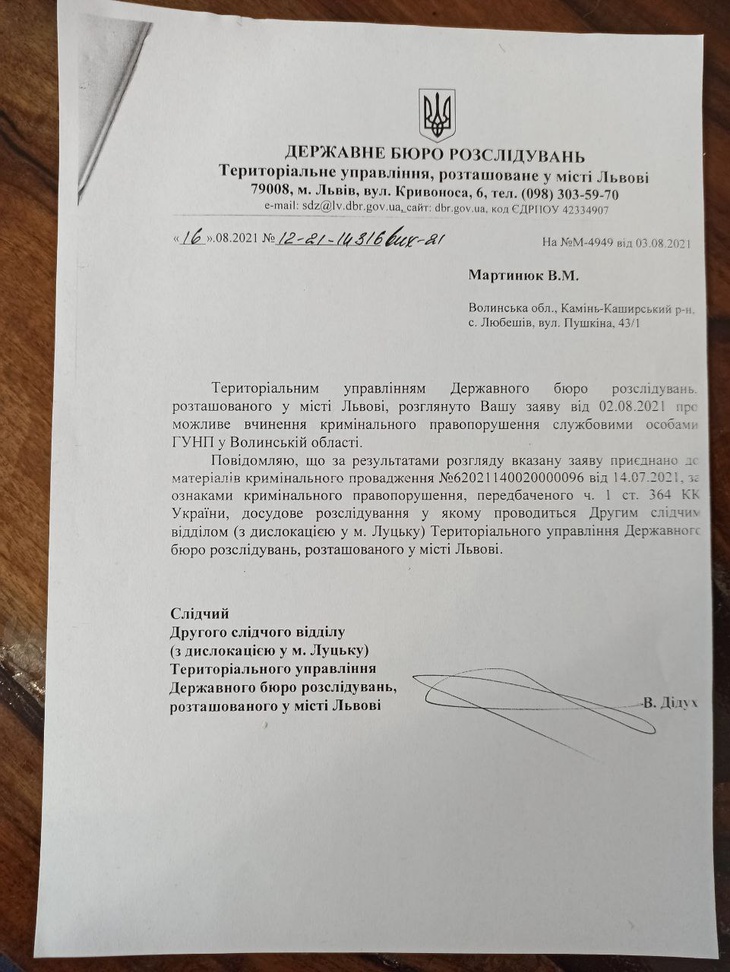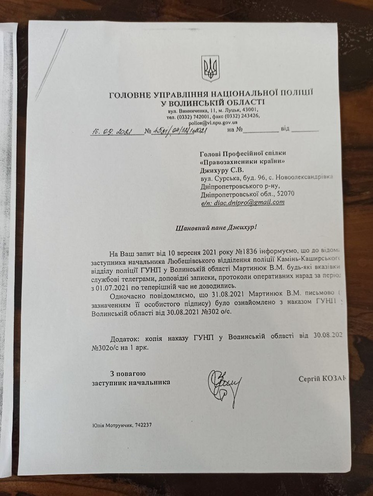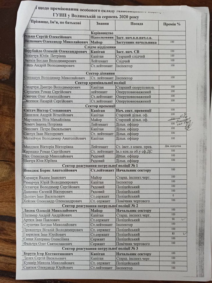 20.11.2020 року на ім’я начальника ГУНП у Волинській області було підготовлено доповідну записку № 5685/25/01-2020 за підписом начальника УОАЗОР ГУНП у Волинській області Ковальчука В.С. «Про недоліки виявлені мобільною групою УОАЗОР ГУНП в ході перевірки діяльності Іваничівського відділення поліції Горохівського ВП ГУНП в області».