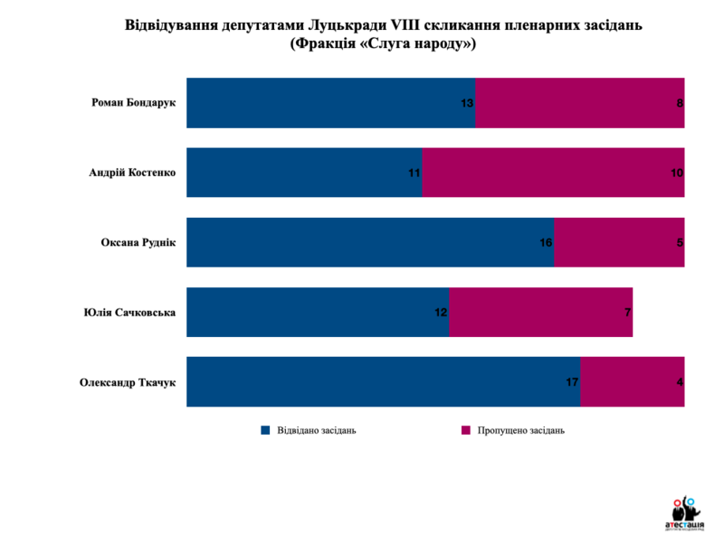 Нагадаємо, у Луцькій міській раді найбільше пленарних засідань сесій станом на кінець листопада 2021 року проігнорував голова фракції «Слуга народу» Роман Бондарук – 8, а також представниця цієї ж фракції Юлія Сачковська – 7.