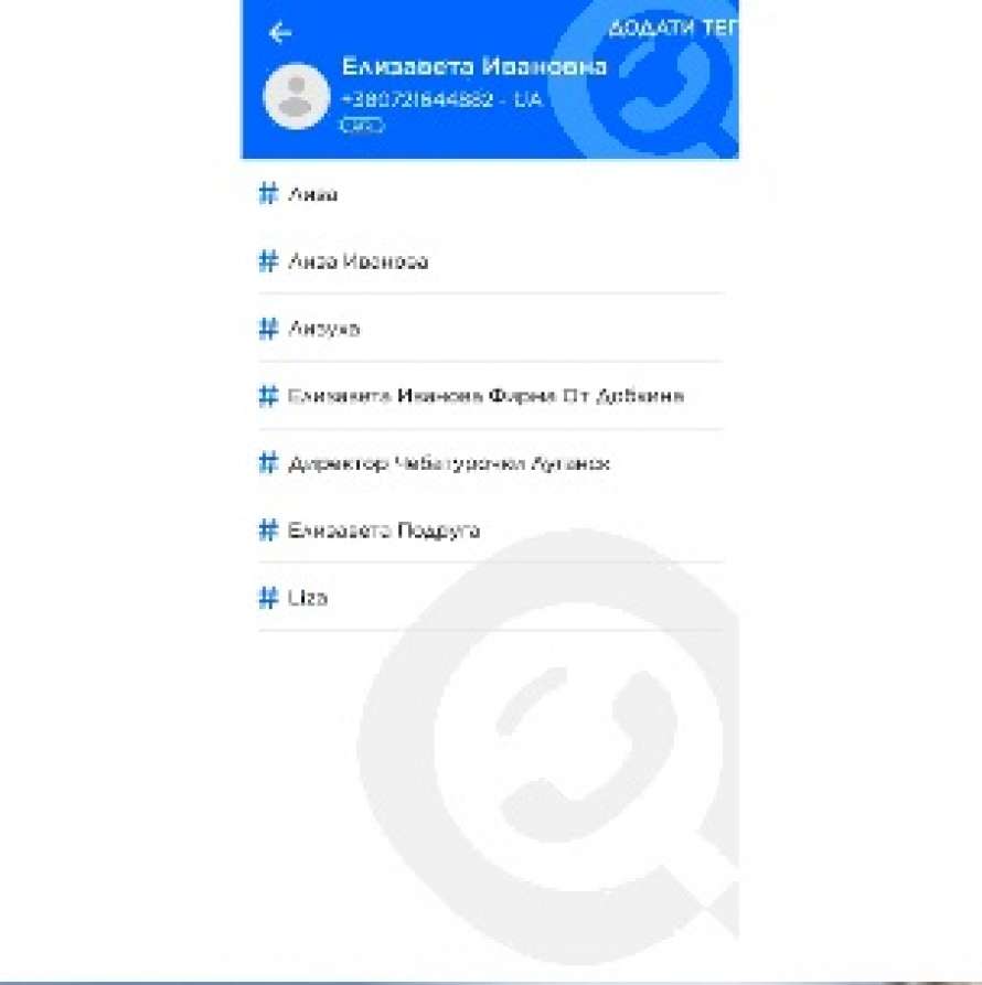 За даними сервісу Getcontact, її номер телефону записаний у знайомих, у тому числі як «Єлизавета Іванова Фірма Від Добкіна» та «Директор Чебатурочки Луганськ».