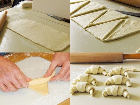 - Робочу поверхню присипати борошном. Розділити тісто на 4 рівних частини, які по черзі треба розкачати в коло. Коли коло готове, його можна вирівняти по краях, щоб рогалики вийшли одного розміру, далі від центральної точки проводити ножем радіуси, щоб вдалося 8 "трикутників". На ширший край трикутничків викласти начинку. Дехто робить не коло, а видовжений пласт, як на картинці нижче. Логіка збережена.